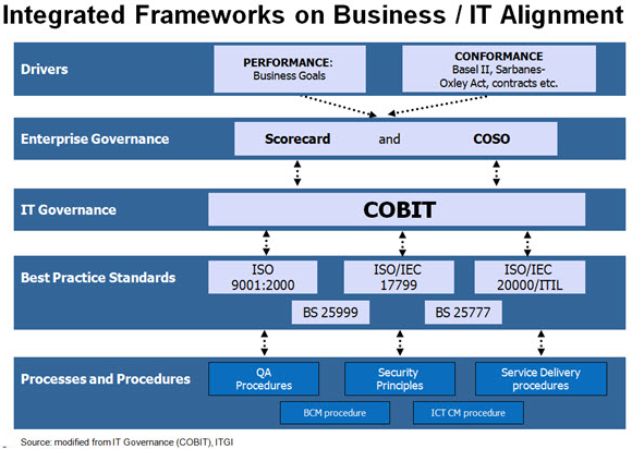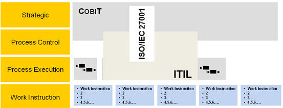āļ āļēāļĒāđāļāđāļāļĢāļāļāđāļāļ§āļāļīāļ CobiT Framework (What to do) āļāđāļāļ·āļ Best Practices āđāļĨāļ°/āļŦāļĢāļ·āļ Standard (How to do) āļāđāļēāļāđāļāļĩāđāļāļāļāđāļāļĢāļāļ§āļĢāļāļģāļĄāļēāļāđāļ§āļĒāļāļĢāļ°āļĒāļļāļāļāđāđāļāđāđāļāļāļēāļĢāļāļąāļāļāļēāļāļąāđāļāļāļāļāđāļāļāļēāļĢāļāļāļīāļāļąāļāļīāļāļēāļāļ āļēāļĒāđāļāļāļāļāđāļāļĢ āđāļĄāđāļ§āđāļēāļāļ°āđāļāđāļ āļĄāļēāļāļĢāļāļēāļ ISO 9000, ISO/IEC27001 (āļāļ·āđāļāđāļāļīāļĄ ISO 17799) ISO/IEC 20000, ITIL v3 , BS25999 (āļāļģāļĨāļąāļāļāļ°āļāļĨāļēāļĒāđāļāđāļāļĄāļēāļāļĢāļāļēāļ ISO 22301) , BS25777 āđāļĨāļ°āđāļāļ·āđāļāđāļŦāđāļŠāļąāļĄāļĪāļāļāļīāđāļāļĨāđāļāļāļēāļāļāļāļīāļāļąāļāļīāļāļĢāļīāļ āļāļđāđāļāļĢāļīāļŦāļēāļĢāļĢāļ°āļāļąāļāļāļĨāļēāļāļāđāļāļāļĨāļāļĢāļēāļĒāļĨāļ°āđāļāļĩāļĒāļāđāļāļĢāļ°āļāļąāļāļāļąāđāļāļāļāļāļāļēāļĢāļāļāļīāļāļąāļāļīāļāļēāļ (Procedure) āļāļķāđāļ CobiTāđāļĨāļ° ISO/IEC 27001 āđāļŦāļĄāļēāļ°āļŠāļĄāļāļĩāđāļāļ°āļāļđāļāļāļģāļĄāļēāđāļāđāđāļāļĢāļ°āļāļąāļ “Strategy”āđāļĨāļ° “Process Control” āđāļāđāđāļāļĢāļ°āļāļąāļ “Process Execution” āļāļąāđāļ ITIL āļāļđāļāļ°āđāļŦāļĄāļēāļ°āļŠāļĄāļāļ§āđāļē (āļāļđāļĢāļđāļāļāļĩāđ 4)