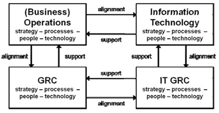 āđāļāļĒāļĄāļĩāļāļ§āļēāļĄāļŠāļąāļĄāļāļąāļāļāđāļāļąāļāļĢāļ°āļŦāļ§āđāļēāļ “āļāļļāļĢāļāļīāļ” “āđāļāļāđāļāđāļĨāļĒāļĩāļŠāļēāļĢāļŠāļāđāļāļĻ” “GRC” āđāļĨāļ° “IT GRC” āđāļāļĨāļąāļāļĐāļāļ° 2 ways āļāļ·āļ “Support” āđāļĨāļ° “Alignment” āļāļķāđāļāļāļąāļāđāļĨāļ°āļāļąāļ (āļāļđāļĢāļđāļāļāļĩāđ 9) āđāļāļĒāļĄāļĩāļāļēāļĢāļāļĢāļ°āļĒāļļāļāļāđāđāļāđ COSO ERM āđāļāļŠāđāļ§āļāļāļāļ “IT Risk Management” āđāļĨāļ° ISO/IEC 38500 “Corporate Governance of IT ” (āļāļđāļĢāļđāļāļāļĩāđ 10) āđāļāļŠāđāļ§āļāļāļāļ “IT Governance”