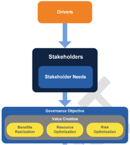 หมายถึง ผู้บริหารองค์กรต้องสามารถแสดงให้เห็นถึง “ประโยชน์ต่อธุรกิจ” (Business Benefits) ที่ชัดเจน และในขณะเดียวกันก็ต้องมีการบริหารจัดการทรัพยากรอย่างมีประสิทธิภาพ และมีการบริหารความเสี่ยงที่อยู่ในระดับที่ยอมรับได้โดยผู้บริหารระดับสูงต้องรับผิดชอบเรื่อง Risk Appetite และ Risk Tolerance ซึ่งในองค์กรประกอบด้วยผู้เกี่ยวข้องจากหลายฝ่าย ดังนั้น เรื่องของ “Governance Objective” เป็นเรื่องของการบริหารสมดุลของประโยชน์ในแต่ละฝ่ายให้ลงตัว เพื่อให้เกิดประโยชน์สูงสุดในภาพรวมขององค์กร โดยก่อนจะมาถึง “Governance Objective” นั้นต้องมาจาก “Stakeholder Needs” และ “Drivers” เสียก่อน (ดูรูปที่ 9)