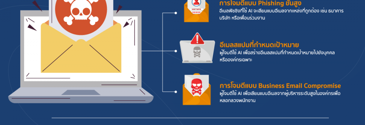 – การโจมตีแบบ Business Email Compromise (BEC): ผู้โจมตีใช้ AI เพื่อเลียนแบบอีเมลจากผู้บริหารระดับสูงในองค์กรเพื่อหลอกลวงพนักงานให้โอนเงินหรือเปิดเผยข้อมูลที่ละเอียดอ่อน.