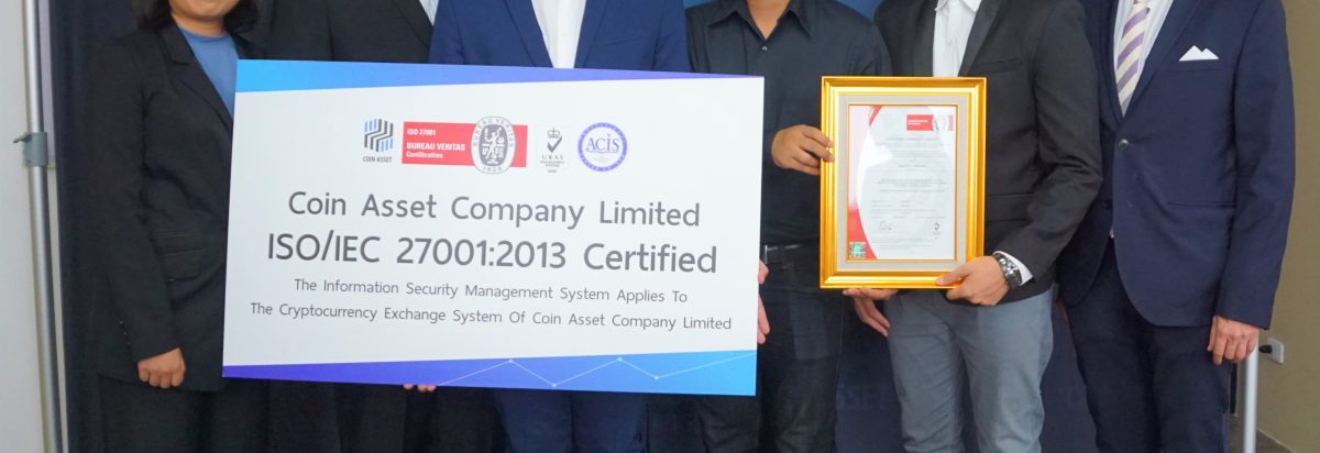 พิธีรับมอบประกาศนียบัตรรับรองมาตรฐาน ISO/IEC 27001:2013 ของ บริษัท คอยน์ แอสเซท จำกัด เมื่อวันที่ 4 ก.ค. 2561 ที่ผ่านมา ณ อาคารพร้อมพันธุ์ ถ.ลาดพร้าว กรุงเทพฯ โดยมีคุณประวาลทอง ทองใหญ่ ณ อยุธยา ผู้จัดการฝ่ายรับรองระบบมาตรฐาน อนุภูมิภาคลุ่มแม่น้ำโขง บริษัท บูโร เวอริทัส เซอทิฟิเคชั่น (ประเทศไทย) และ ดร. ปริญญา หอมเอนก ประธานและผู้ก่อตั้ง บริษัท เอซิส โปรเฟสชั่นนัล เซ็นเตอร์ จำกัด ในฐานะที่ปรึกษา เข้าร่วมแสดงความยินดีกับคุณศิวนัส ยามดี (ที่ 3 จากซ้าย) ประธานเจ้าหน้าที่บริหาร บริษัท คอยน์ แอสเซท จำกัด และทีมบริหารฯ