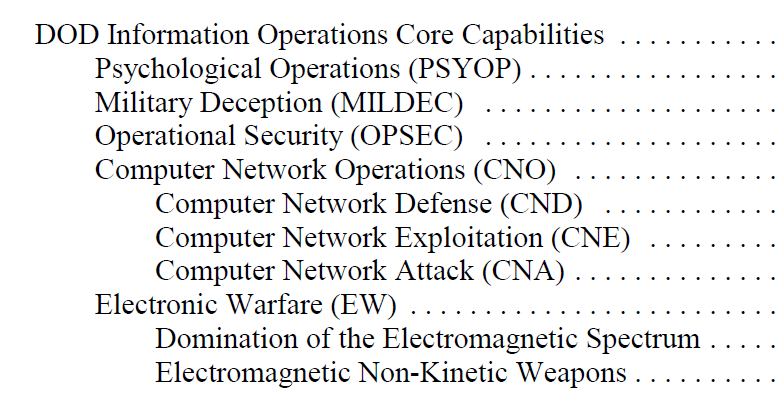 ใน ส่วนของการปฏิบัติการทางด้านเครือข่ายคอมพิวเตอร์ (Computer Network Operations หรือ “CNO”) จะประกอบด้วย 3 ส่วนหลักๆ (ดูรูปที่ 2) ได้แก่ 1. การโจมตีเครือข่ายคอมพิวเตอร์เพื่อทำลายระบบเครือข่ายของฝ่ายตรงข้ามให้ล่ม หรือใช้งานไม่ได้ (Computer Network Attack หรือ “CNA”) 2. การป้องกันการโจมตีเครือข่ายคอมพิวเตอร์ของเราจากฝ่ายตรงข้าม (Computer Network Defense หรือ “CND”) 3. การเจาะแอบเอาข้อมูลจากเครือข่ายคอมพิวเตอร์ของฝ่ายตรงข้าม (Computer Network Exploitation หรือ “CNE”)