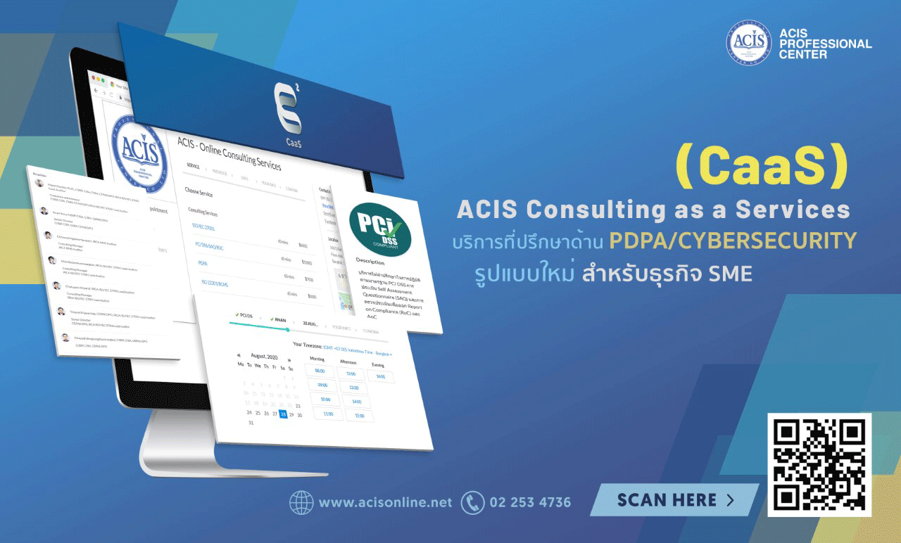 บริการด้านที่ปรึกษารูปแบบใหม่ รองรับยุค New Normal สำหรับธุรกิจ SME “CaaS” Consulting as a Services โซลูชั่นใหม่ของทาง ACIS ที่จัดทำขึ้นมาเพื่อให้ผู้คนสามารถเข้าถึงที่ปรึกษาด้าน PDPA และ Cybersecurity ได้สะดวก และรวดเร็วขึ้น ผ่าน Conference Call