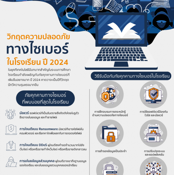 ในยุคที่เทคโนโลยีมีบทบาทสำคัญในระบบการศึกษา โรงเรียนกำลังเผชิญกับภัยคุกคามทางไซเบอร์ที่เพิ่มขึ้นอย่างมาก ปี 2024 คาดว่าจะเป็นปีที่วิกฤตนี้ทวีความรุนแรงมากขึ้น บทความนี้จะเจาะลึกถึงภัยคุกคามทางไซเบอร์ที่โรงเรียนอาจเผชิญในปี 2024 และแนะนำวิธีรับมือเพื่อปกป้องข้อมูลและความปลอดภัยของนักเรียน. ภัยคุกคามทางไซเบอร์ที่พบบ่อยที่สุดในโรงเรียน. – การโจมตีแบบ Phishing: ผู้โจมตีส่งอีเมลหรือข้อความปลอมเพื่อหลอกล่อนักเรียนและเจ้าหน้าที่ให้เปิดเผยข้อมูลส่วนบุคคล เช่น รหัสผ่าน.– มัลแวร์:- ซอฟต์แวร์ที่เป็นอันตรายซึ่งติดตั้งโดยไม่รู้ตัว ซึ่งอาจขโมยข้อมูล ทำลายไฟล์ หรือแม้แต่ควบคุมคอมพิวเตอร์.– การโจมตีแบบ Ransomware: มัลแวร์ที่เข้ารหัสไฟล์ในคอมพิวเตอร์และเรียกค่าไถ่เพื่อแลกกับการถอดรหัสไฟล์.– การโจมตีแบบ DDoS: ผู้โจมตีส่งคำขอจำนวนมากไปยังเว็บไซต์หรือเครือข่าย ทำให้เว็บไซต์หรือเครือข่ายดังกล่าวล่ม.– การขโมยข้อมูลส่วนบุคคล: ผู้โจมตีอาจเข้าถึงฐานข้อมูลของโรงเรียนและขโมยข้อมูลส่วนบุคคลของนักเรียน เช่น […]