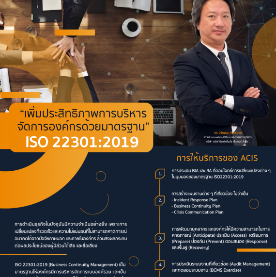 การดำเนินธุรกิจในปัจจุบันมีความจำเป็นอย่างยิ่ง เพราะการเปลี่ยนแปลงที่รวดเร็วและความไม่แน่นอนที่ไม่สามารถคาดการณ์อนาคตได้จากปัจจัยภายนอก และภายในองค์กร ล้วนส่งผลกระทบต่อผลประโยชน์ของผู้มีส่วนได้เสียและชื่อเสียง ISO 22301:2019 (Business Continuity Management) เป็นมาตรฐานให้องค์กรมีการบริหารจัดการแบบองค์รวม และเป็นกรอบการสร้างขีดความสามารถให้องค์กรมีความยืดหยุ่น เพื่อตอบสนองและปกป้องผลประโยชน์ของผู้มีส่วนได้ส่วนเสียหลัก ชื่อเสียงและกิจกรรมที่สร้างมูลค่าที่มีประสิทธิผล การให้บริการของทาง ACIS 1.การประเมิน BIA และ RA ที่ตอบโจทย์การเปลี่ยนแปลงต่าง ๆ ในมุมมองของมาตรฐาน ISO22301:2019 2.การสร้างแผนงานต่าง ๆ ที่เกี่ยวข้อง ไม่ว่าเป็น– Incident Response Plan– […]